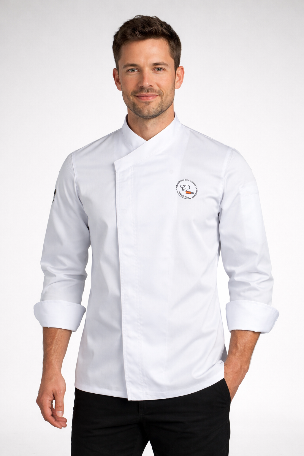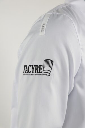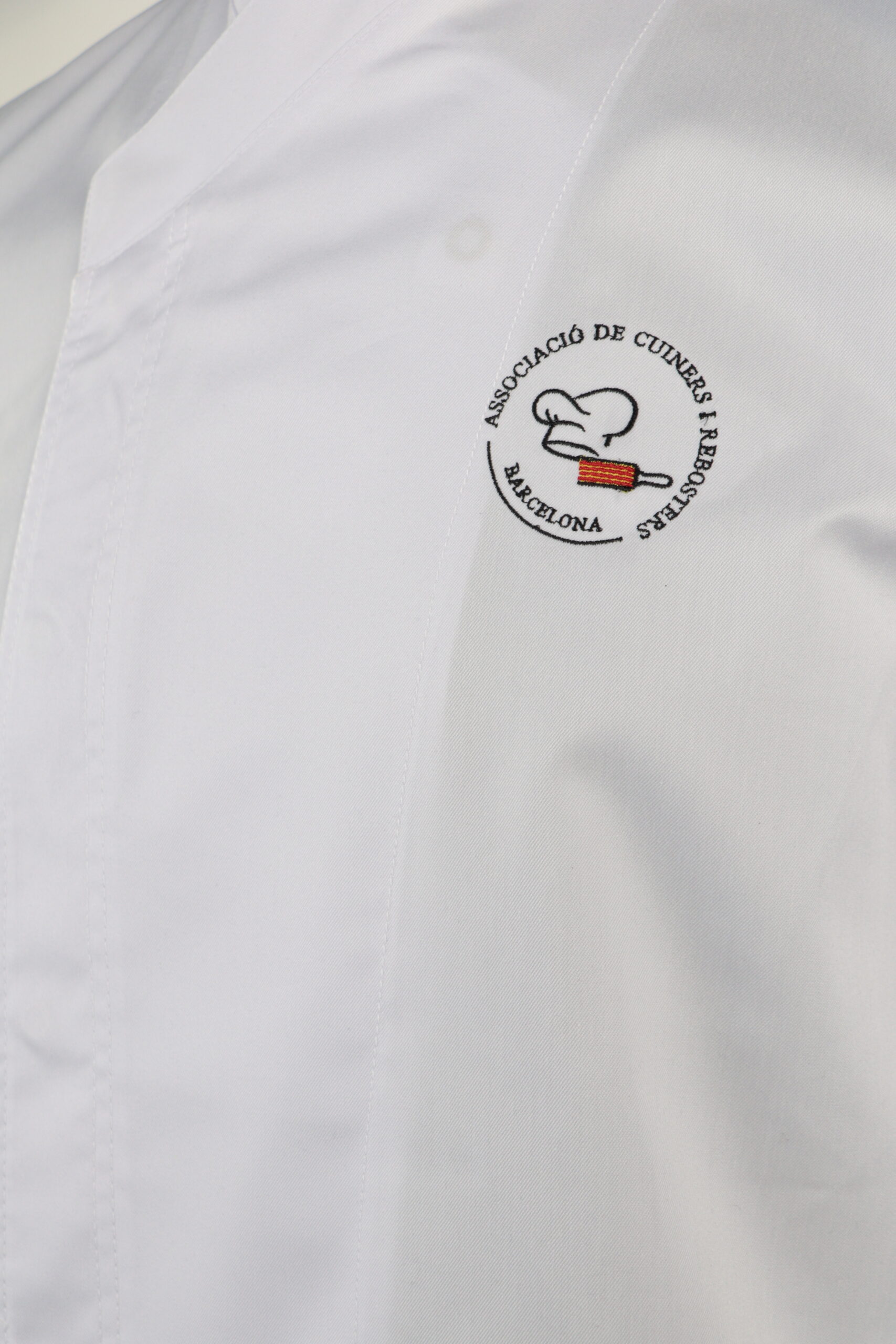 Incluye bordado del logotipo de Associació de Cuiners i Rebosters Barcelona en el pecho y el logotipo FACYRE en la manga.