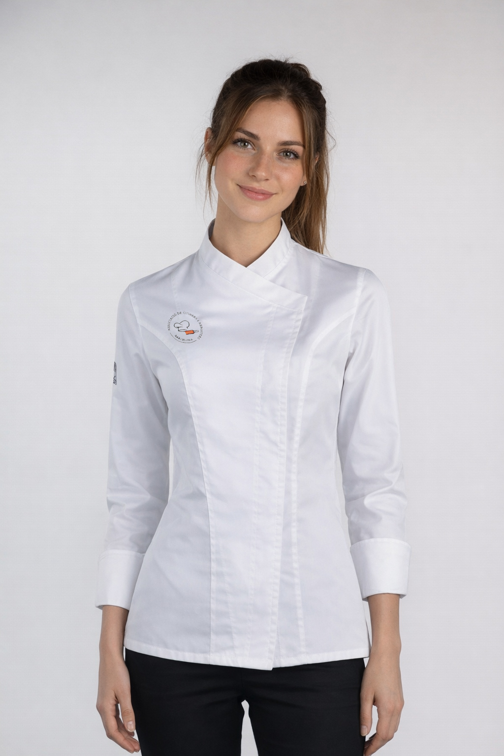 Incluye bordado del logotipo de Associació de Cuiners i Rebosters Barcelona en el pecho y el logotipo FACYRE en la manga.